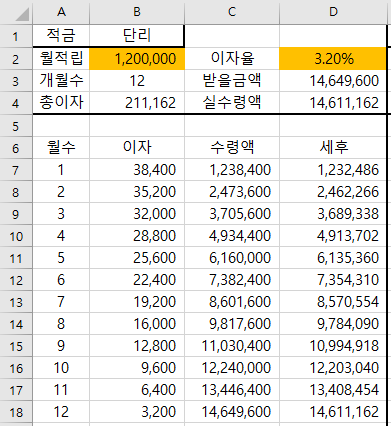 월 정해진 금액을 정해진 기간 불입하면 그에 상응하는 이자를 받게 된다. 위의 경우를 보면 월 120만 원을 12개월 동안 넣은 것이다. 이자율은 3.2%라고 정해놓았다.