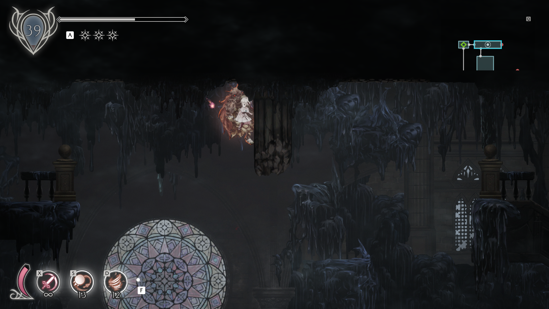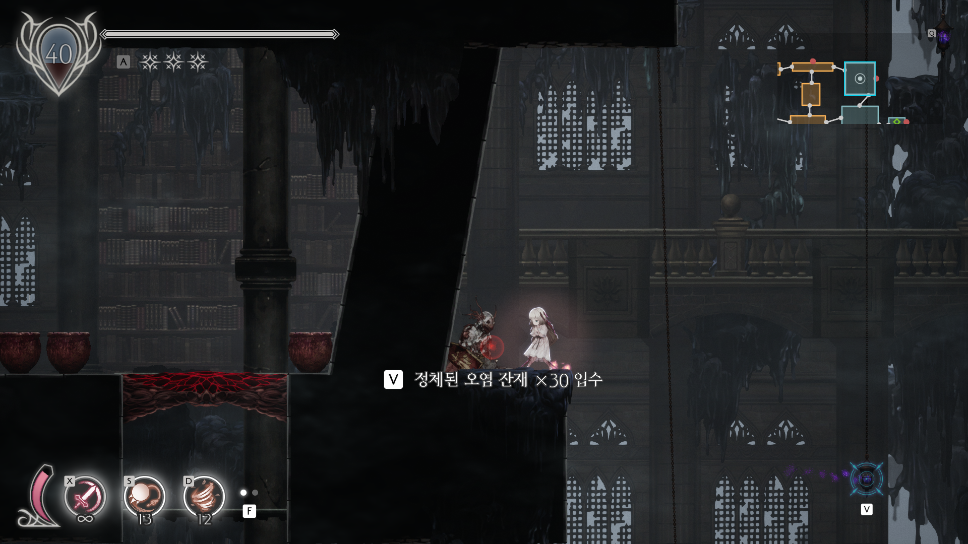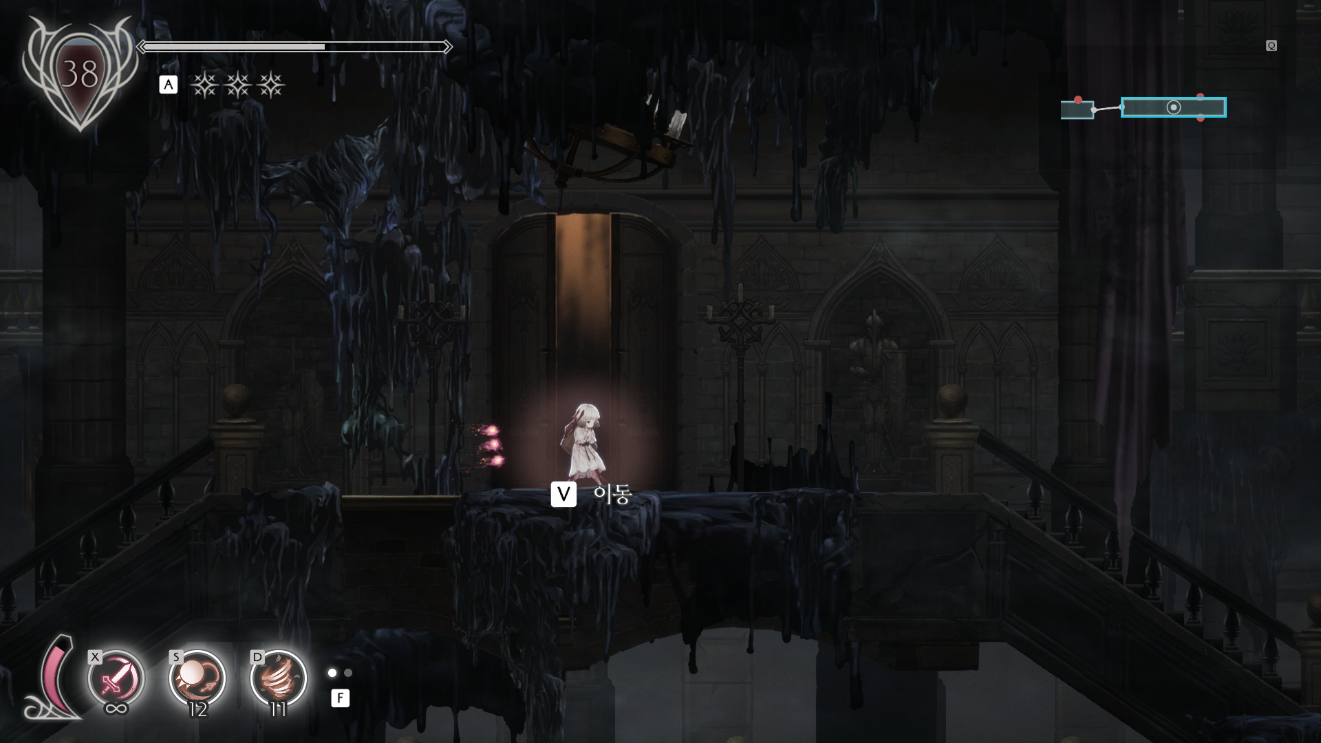 위로 올라가서 떨어지면 수많은 몬스터들을 잡아야 문이열리는 번거로움이 있습니다. 따라서 옆에 이런 벽이 있는데 벽을 탄 후에 점프하여 떨어지면서 끝부분에서 우측방향으로 직진회피를 해주고 다시 기둥을 잡아주면 됩니다. 옆으로 쭉 가면 잔재하나 먹고 바로 옆칸으로 갈 수 있습니다.