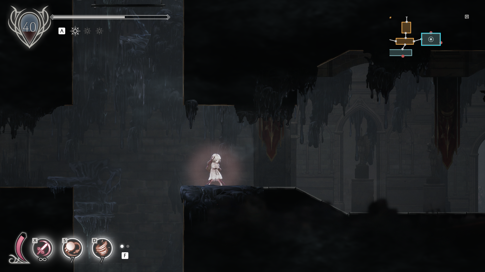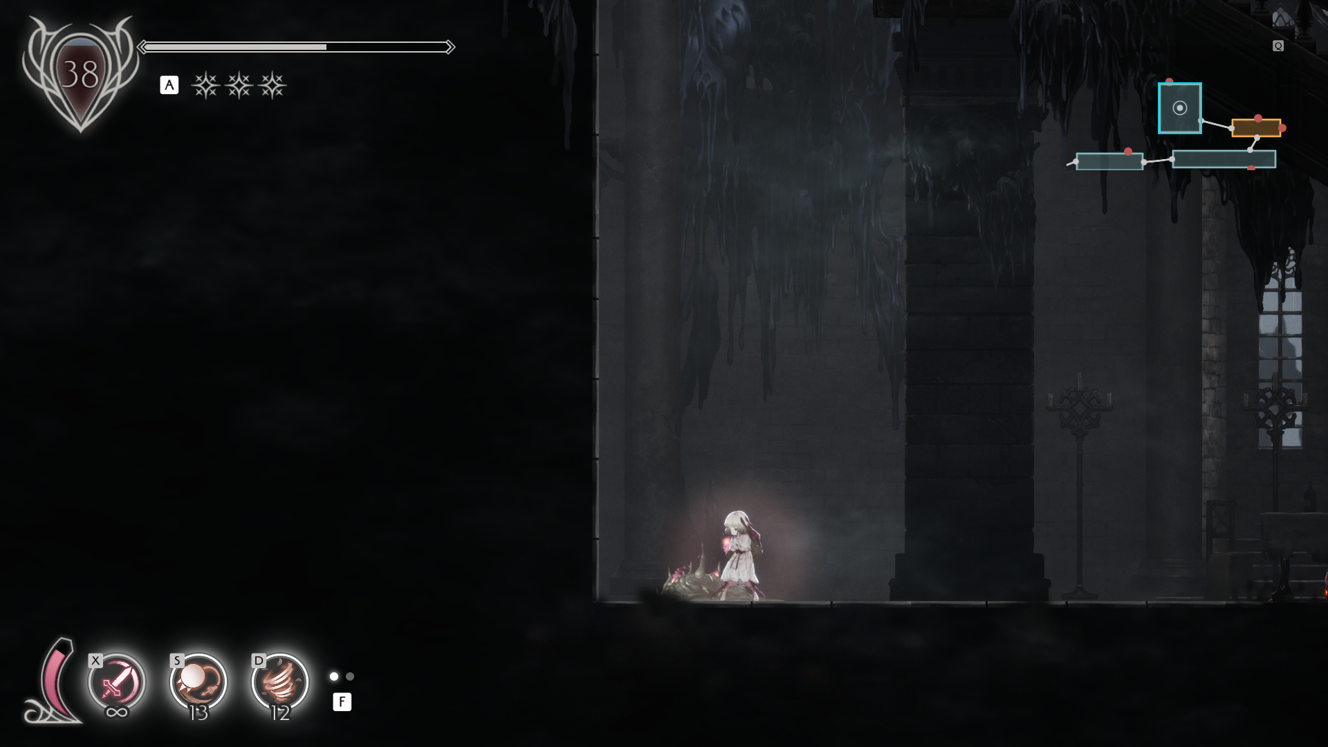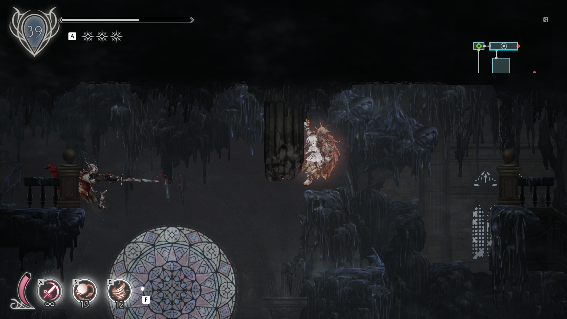 위로 올라가서 떨어지면 수많은 몬스터들을 잡아야 문이열리는 번거로움이 있습니다. 따라서 옆에 이런 벽이 있는데 벽을 탄 후에 점프하여 떨어지면서 끝부분에서 우측방향으로 직진회피를 해주고 다시 기둥을 잡아주면 됩니다. 옆으로 쭉 가면 잔재하나 먹고 바로 옆칸으로 갈 수 있습니다.