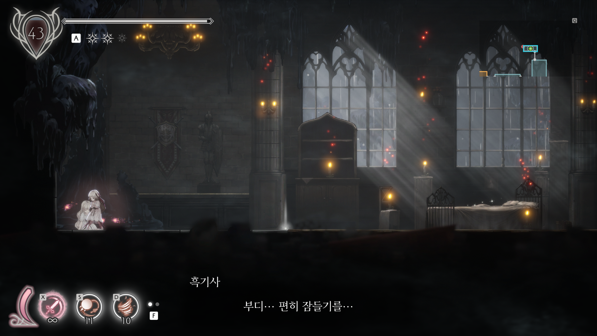 86으로 올라가면 2갈래 길이 있습니다. 좌측으로 가면 2번만 거치면 세이브포인트까지 가지만 우측으로 가면 4번을 거쳐야합니다. 좌측은 잡아야할 몬스터들이 많아서 체력관리가 힘들고 어렵습니다. 하지만 우측은 크게 어렵지 않고 먹을 아이템도 많아서 우회해도 괜찮으리라봅니다. 90번 율리우스를 잡으면 완료가 되고 돌진스킬을 얻을 수 있게됩니다. 양옆 빨간 벽을 뚫을 수 있게 됩니다.